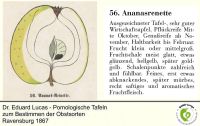 Beschreibung:Frucht mittelgroß, 60 bis 70 Millimeter hoch und breit, abgestumpft, hoch gebaut, kelchwärts etwas zugespitzt, stielwärts abgeplattet. Kelch offen, Blättchen grünlichbraun, stark wollig, zurückgeschlagen. Einsenkung flach, eng, von feinen Falten umgeben. Stiel mittellang, dünn, holzig, Höhle mäßig tief und weit, grün oder manchmal strahlig berostet. Schale ziemlich glatt, leuchtend gelb, später goldgelb, Rostpunkte zahlreich und sehr deutlich hervortretend, Roststernchen mit grünem Hof sind charakteristisch. Fleisch gelblichweiß, sehr saftig, abknackend, später mürbe, von sehr edlem, gewürztem, süßweinigem Geschmack. Geruch merklich hervortretend. Kernhaus groß, Kammern weit offen, glattwandig, mit vielen schönen, glänzendbraunen Samen gefüllt.