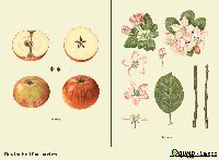 Beschreibung:Frucht mittelgroß, flachrund, 65 bis 85 mm breit, 55 bis 70 mm hoch, mittelbauchig, schief gebaut. Kelch halboffen oder geschlossen, Blättchen breit, grün, wollig. Spitzen nach außen gebogen, Einsenkung seicht, schüsselförmig, mit feinen, flachen, zur Mitte der Frucht verlaufenden Falten. Stiel dünn und kurz, Höhle trichterförmig, zimtfarbig berostet. Schale fein, glatt, glänzend, Grundfarbe erst grünlich- später leuchtend gelb, wovon aber bei besonnten Früchten wenig zu sehen ist, da sie meist stark karmesinrot überzogen sind. Meist sind auch dunkler gefärbte Streifen erkennbar. Punkte spärlich, klein, braun. Fleisch gelblich-weiß, ziemlich fest, saftig, ohne besondere Würze. Kernhaus geschlossen, Fächer klein, Samen langeiförmig, zugespitzt braun.