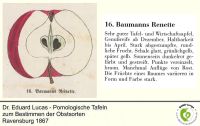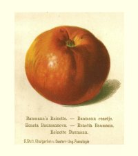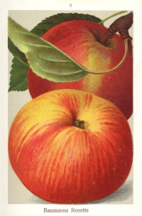 Geschichte:Die Sorte wurde zu Beginn des vorigen Jahrhunderts von dem Belgier van Mons gezogen und zu Ehren der Baumschulenbesitzer Gebrüder Baumann benannt. Heißt auch noch Baumanns Rote Winterrenette, unter welchem Namen sie Diel 1821 zuerst beschrieb. Ist heute allgemein bekannt und verbreitet.
