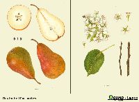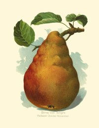 Beschreibung:Groß, 95 Millimeter lang, 70 Millimeter breit, länglich, kegelförmig, kelchwärts schön abgerundet, stielwärts kegelförmig und einseitig etwas eingezogen. Kelch wenig offen, hornartig, kleinblättrig; sitzt in enger ziemlich tiefer, etwas beuliger Einsenkung. Stiel lang, mäßig stark, holzig, oben aufsitzend, von Fleischringeln umgehen, oft von einem Fleischwulst seitlich gedrückt. Schale fest, fühlt sich rau an, erst gelbgrün, später hochgelb, zimtfarbig berostet, sonnenseits orangekarmin verwaschen. Fleisch gelblichweiß, halb schmelzend bis schmelzend, fein, saftreich, von äußerst angenehmen, süßsäuerlichem, aromatischem Geschmack. Kernhaus schwach hohlachsig, von sehr feinen Körnchen umgeben; die kleinen Kammern enthalten kleine, schwarzbraune Samen.