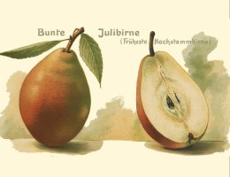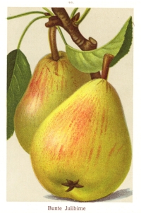 Geschichte:Die Sorte wurde von dem Baumschulenbesitzer Boisbunnel in Rouen, Frankreich, gezogen und 1857 in den Handel gebracht. Er nannte sie Colorée de Juillet, während Lauche, der sie zuerst deutsch beschrieben hat, sie Julischönheit nannte, welcher Name sich aber nicht eingebürgert hat. Doch Oberdieck beschrieb sie bereits ebenfalls als Bunte Julibirne. Sie ist heute ziemlich bekannt und verbreitet.