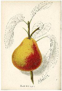 Beschreibung:Frucht mittelgroß, etwa 63 Millimeter hoch und 62 Millimeter breit, stumpf-kugelförmig, Bauch dem Kelch genähert, stielwärts schwach eingezogen und am Stiel abgestumpft. Kelch groß, weit offen, Blättchen klein, zurückgeschlagen, Einsenkung weit, flach, von Falten umgeben, die oft einen rötlichen Anflug haben. Stiel kurz, dick, mit stark hervortretenden Auswüchsen, Sortenmerkmal, in flacher Vertiefung oder fast obenauf sitzend. Schale fein, glatt, erst grünlich-gelb, später lebhaft gelb, sonnenseits meist streifig gerötet, welche Streifen jahrgangsweise undeutlich werden und in rote Flecke zusammenlaufen, die aber selten so lebhaft sind wie auf dem Bild. Kleine Rostfiguren finden sich auf den meisten Früchten, besonders um den Stiel. Fleisch weißlich, halbschmelzend, saftreich, schwach gewürzt, süßweinig. Kernhaus schwach hohlachsig. Fächer geräumig, lang zugespitzte Samen enthaltend. Das Kernhaus ist durch dicke Körnchen deutlich abgegrenzt.