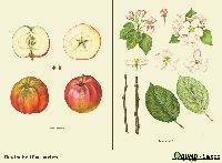 Beschreibung:Frucht mittelgroß, 70 – 75 mm breit und 65 – 70 mm hoch. Der Baum sitzt in der Mitte und flacht sich nach Kelch und Stiel gleichmäßig ab. Kelch meist geschlossen, Blättchen langgespitzt, grün, wollig, Einsenkung ziemlich flach mit vielen Falten und kalvillartigen Rippen, die über die ganze Frucht verlaufen. Daneben findet sich eine scharfe Naht, die auf einer Fruchthälfte vom Kelch bis zum Stiel verläuft. Stiel stark und kräftig, sehr verschieden lang, grün oder braun, sitzt in enger, doch tiefer, strahlig berosteter Höhle. Schale fein, glatt, fettig sich anfühlend, Grundfarbe grünlichgelb, auf der Sonnenseite, oft auf der ganzen Frucht karmoisinrot verwaschen, gefleckt und geflammt, auch gestreift. Fleisch weißlichgelb, unter der Schale oft gerötet, grünlich geadert, saftig und fein, rosenartig gewürzt, süßweinig und äußert erfrischend. Kernhaus hohlachsig, Fächer geöffnet, groß, aufgerissen, gut ausgebildete, dunkelbraune Samen enthaltend.
