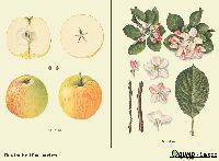 Beschreibung:Frucht mittelgroß, etwa 65 mm breit und 58 mm hoch, hochaussehend, große Früchte, mehr breit, mittelbauchig, beide Wölbungen wenig verschieden, mit unter flache Erhabenheiten auf der Kelchfläche. Kelch groß, offen oder geschlossen, Blättchen grün, lang, aufgerichtet, die längsten zurückgeschlagen. Einsenkung mäßig weit, ziemlich tief, durch Fleischperlen und Falten uneben. Stiel bis 2 cm lang, ziemlich stark, auch kürzer und fleischig, braun oder grün, meist schiefstehend, Stielhöhle tief und eng, trichterförmig faltig, zart strahlenförmig berostet. Schale glatt, glänzend, geschmeidig, zur Reife fett, erst grünlich-, später zitronengelb, sonnenseitig leuchtend kirschrot verwaschen, geflammt und gestreift, Punkte fein, zerstreut, kelchwärts dichter, meist nur weißliche Tupfen, Rost selten. Fleisch gelblichweiß, anfangs fest, aber bald mürbe, saftig, gut gewürzt, mit feiner Säure und genügend süß, ein feiner Herbstapfel ersten Ranges. Kernhaus stark hohlachsig, Kammern geöffnet, geräumig, Wände zerrissen, Samen zahlreich, groß, länglichoval, braun.