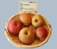 Geschichte:Der rote Boskoop, auch Blutroter Boskoop genannt, wurde als besondere Spielart des alten Schönen von Boskoop von Schmitz-Hübsch aufgefunden und verbreitet. Man sagt dieser Spielart nach, dass sie wegen ihrer ganz hervorragenden Eigenschaften den alten Boskoop verdrängen werde, sobald sie überall bekannt geworden ist. Der bekannte Obstbaufachmann und Pomologe Ökonomierat Anton Kroneder sagt zu dieser Spielart folgendes: „Ich wage es nicht, dieser Spielart des Schönen von Boskoop den Charakter einer eigenen Sorte zu verleihen.“ Es ist höchstens eine Standortsform, die auch von der Unterlage hervorgerufen wird, wie bereits von mehreren Seiten berichtet wurde. Auf Kleinformen, die den echten Metzer Paradies (EM IX) als Unterlage haben und deren Bäume in sehr sonniger Lage stehen, nehmen die Früchte häufig eine rote Färbung an, wie sie ja auch die Obsttafel Nr. 30 zeigt. Solange diese Form nicht fixiert ist, d. h. durch Veredlung sich fortpflanzen lässt, ist der Charakter einer Sorte nicht erwiesen.